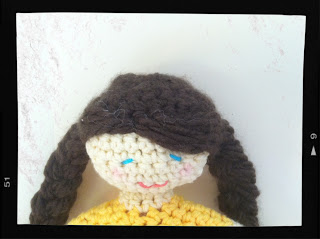 The Hair: When I'm done with her face, I need to finish the head and add hair.  I change the color of yarn I am using to whatever I want to use for her hair and then begin to do a sc all the way around the flesh colored parts of her head.  After establishing the new color, I do decreases in this color until I have a head shape, finish stuffing her, and then close her off. Lastly, I add her braids and bangs.